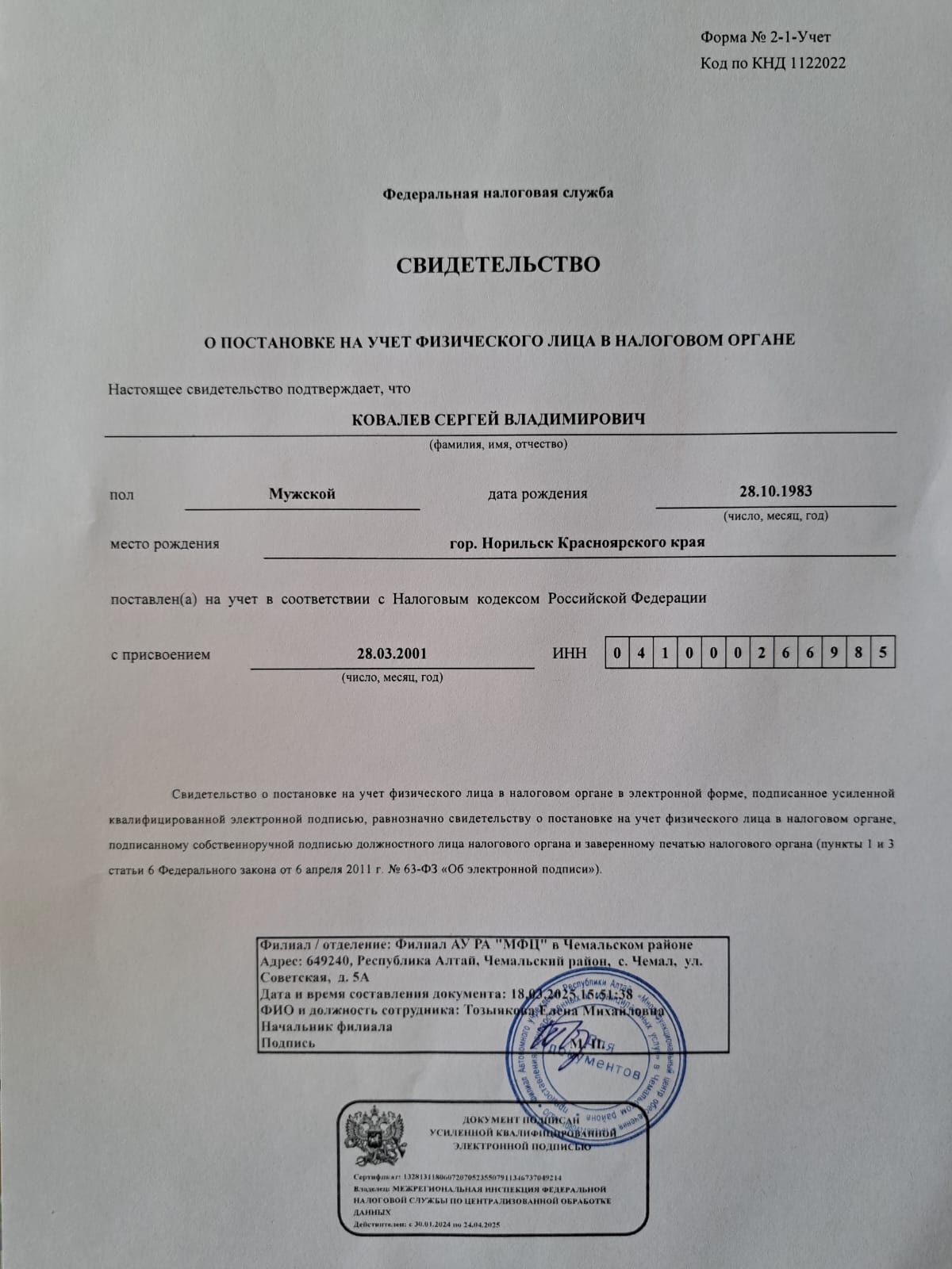 ИНН 041000266985